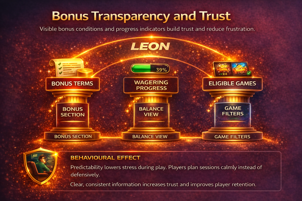 Leon Casino presents bonus conditions, wagering progress, and eligible games directly within the active interface rather than isolating them in static terms pages. This transparency is maintained throughout the entire bonus lifecycle, from activation to completion and withdrawal eligibility. Visual indicators such as wagering counters and game filters update in real time, reflecting the current bonus state. The system is designed so that bonus rules are encountered contextually, exactly when they matter.